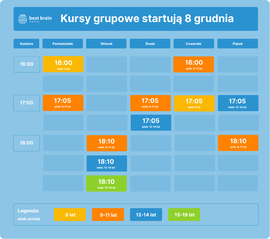 minimum 24-lekcje online prowadzone przez certyfikowanego trenera Best Brain realizowane w małych grupach (lekcja trwa 60 minut)